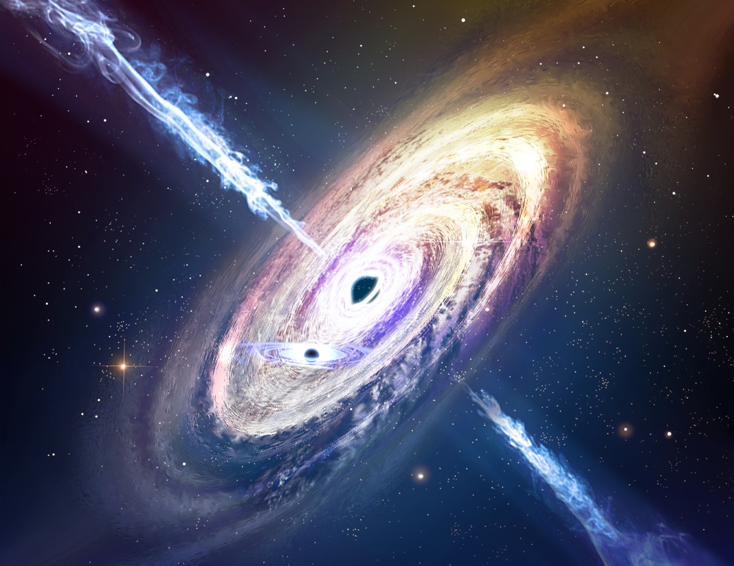 An artist’s impression of a supermassive binary black hole system (SMBBH).