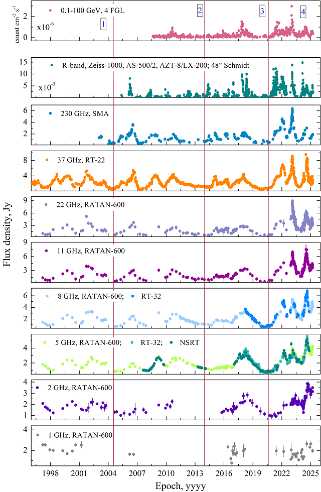 Блазар Ton 599 относится к числу ярких радиоквазаров с плоским спектром и известен мощными вспышками, в том числе в гамма-диапазоне высоких энергий. В предыдущих работах в его излучении уже отмечались признаки квазипериодической переменности на масштабах нескольких лет. В нашем исследовании был проведён анализ его поведения на основе данных наблюдений на отечественных радио и оптических телескопах, таких как, РАТАН-600 и Цейсс-1000 (САО РАН), РТ-22 (КрАО РАН), РТ-32 (ИПА РАН), а также привлечению измерений в гамма-диапазоне космической обсерватории Ферми и субмиллиметровом массиве (Submillimeter Array, SMA) Гавайской обсерватории (Рис. 2). В результате удалось исследовать многоволновое поведение Ton 599 на интервале времени 30-40 лет — 1983-2025 гг.