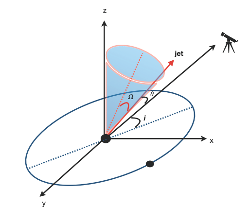 Схема, иллюстрирующая орбитальное движение струи и прецессию (элементы показаны не в масштабе). Двойная сверхмассивная чёрная дыра показана двумя чёрными точками, струя — красной стрелкой, угол между ней и линией зрения наблюдателя равен θ, угол наклона орбиты относительно наблюдателя равен i, а угол прецессионного конуса равен Ω.