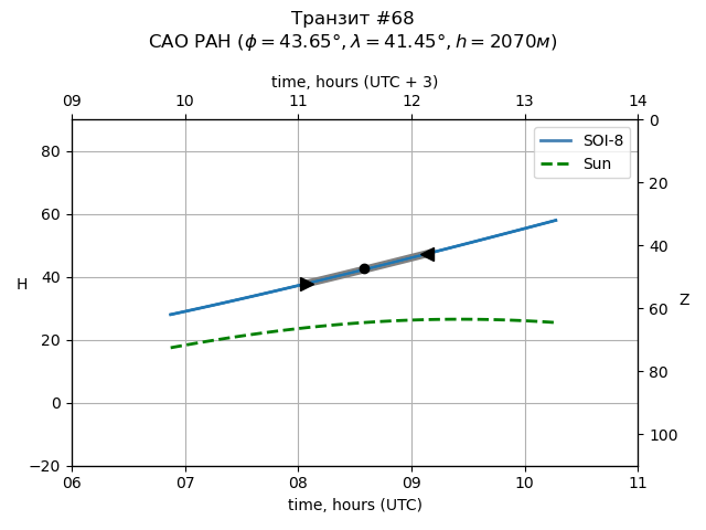 | Object | Date t_1 (UTC) | Date t_mid (UTC) | Date t_4 (UTC) | Day t_1 (UTC) | Time t_1 (UTC) | Time t_mid (UTC) | Time t_4 (UTC) | Time t_1 (UTC+3) | Time t_mid (UTC+3) | Time t_4 (UTC+3) | ra | dec | mag_0 | dep (mag) | dur (h) | Visible (SAO) |