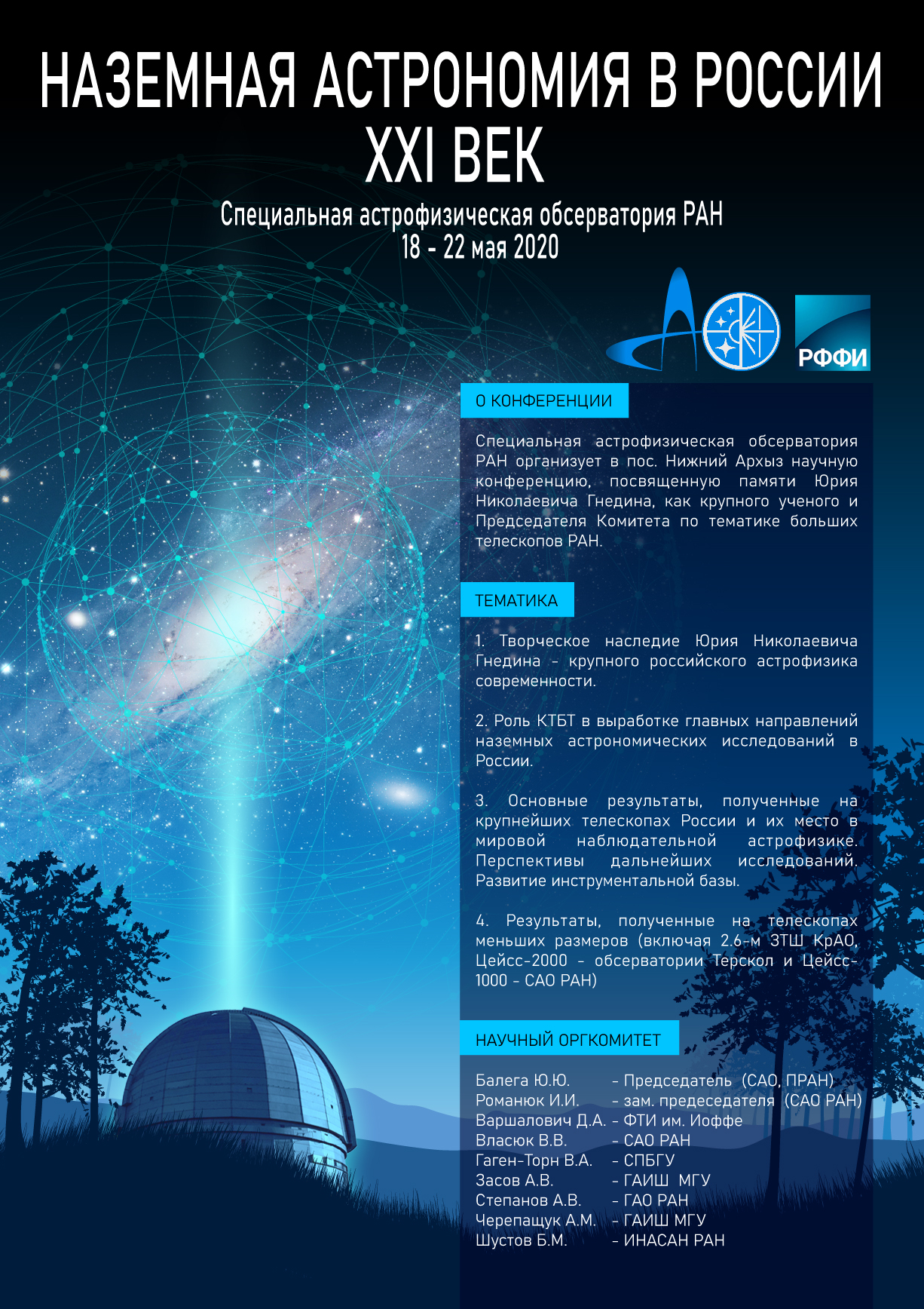 В 2019-2020 годах исполняется 45 лет первым наблюдениям на РАТАН-600 и БТА и 30 лет наблюдениям на 1-м телескопе САО РАН. Для участия в конференции приглашаются астрономы России и других стран мира.